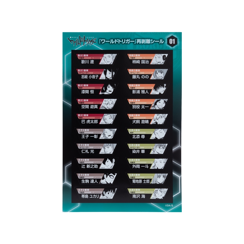 『ワールドトリガー』の遠征選抜メンバーたちがデザインされたステッカーシート3枚セット。再剥離するからとても便利!
