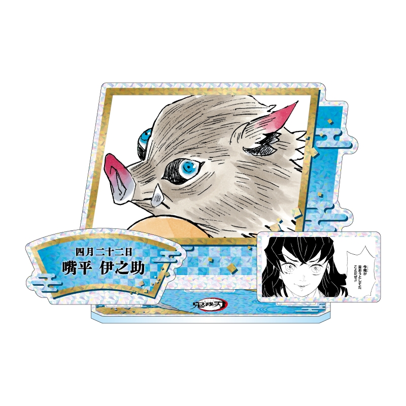 嘴平伊之助のカラーイラスト+名前&誕生日+作中の名場面のコマイラストのパーツが立体的に組みあがった、アクリルジオラマフィギュア!